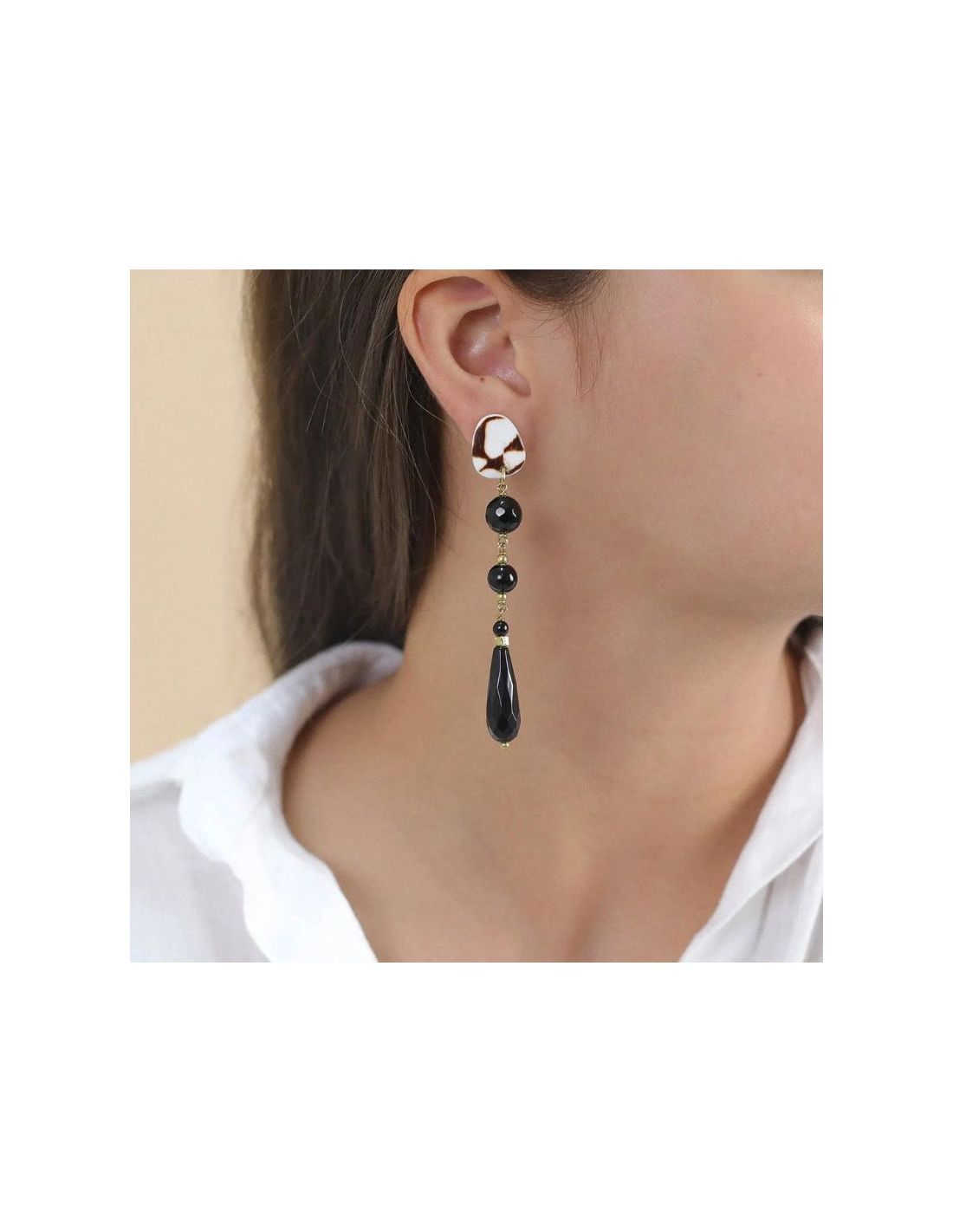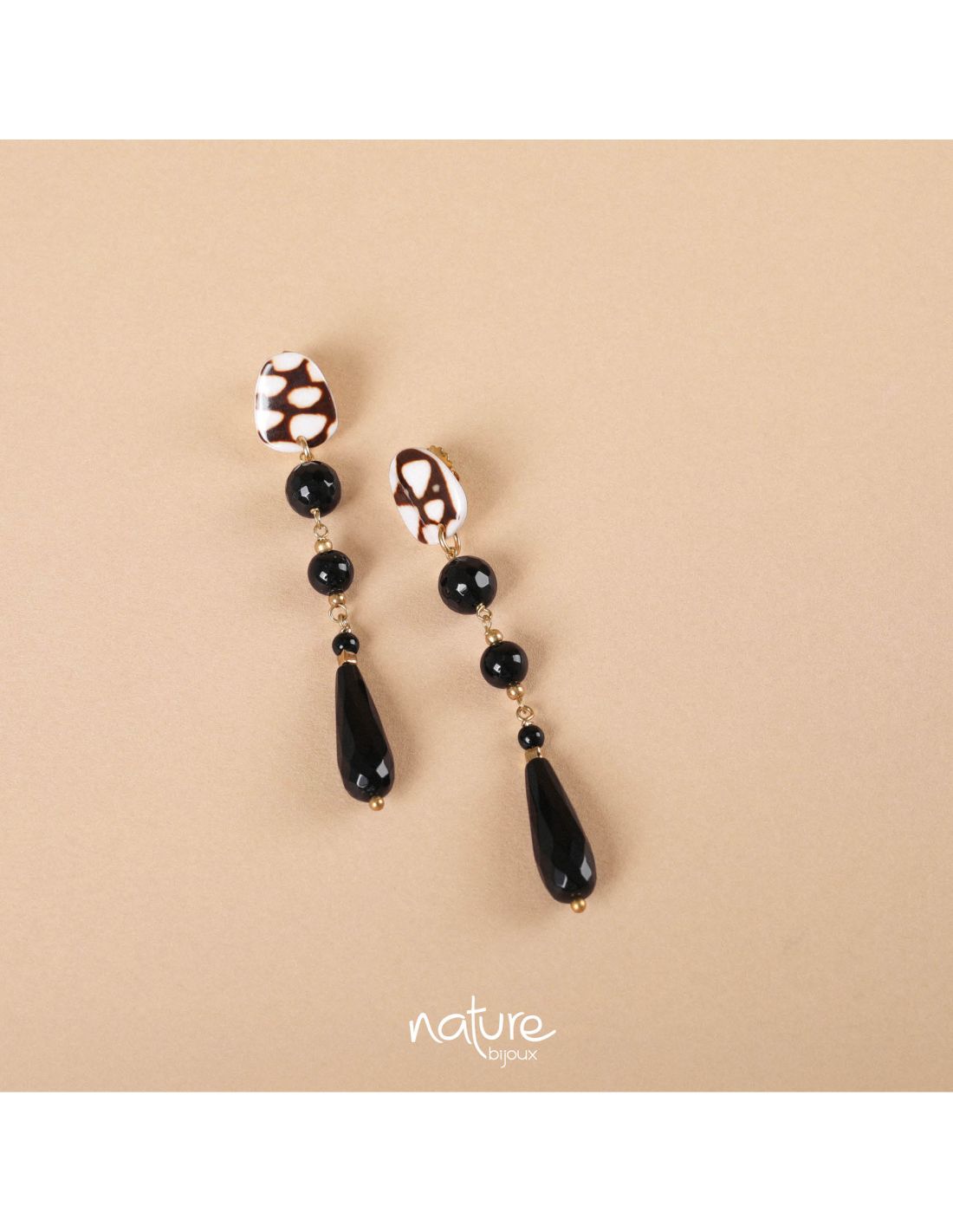 Les boucles d'oreilles longues collection Bagheera signée Nature Bijoux sont des boucles poussoirs avec perles d'agate noire facetées et coquillage