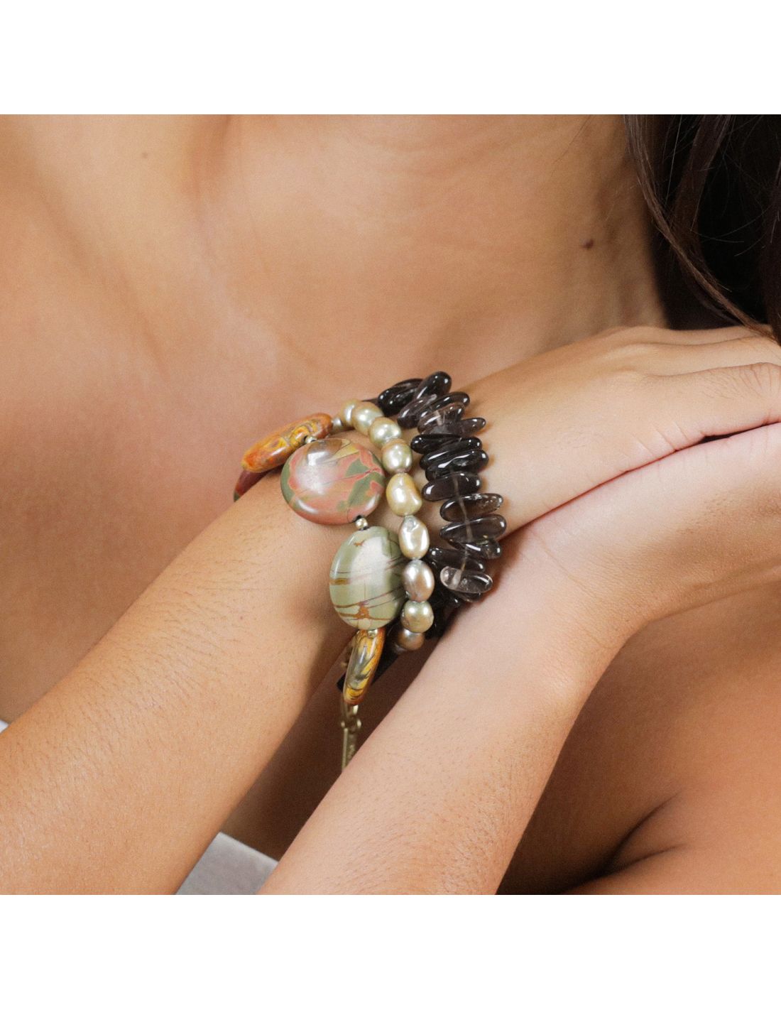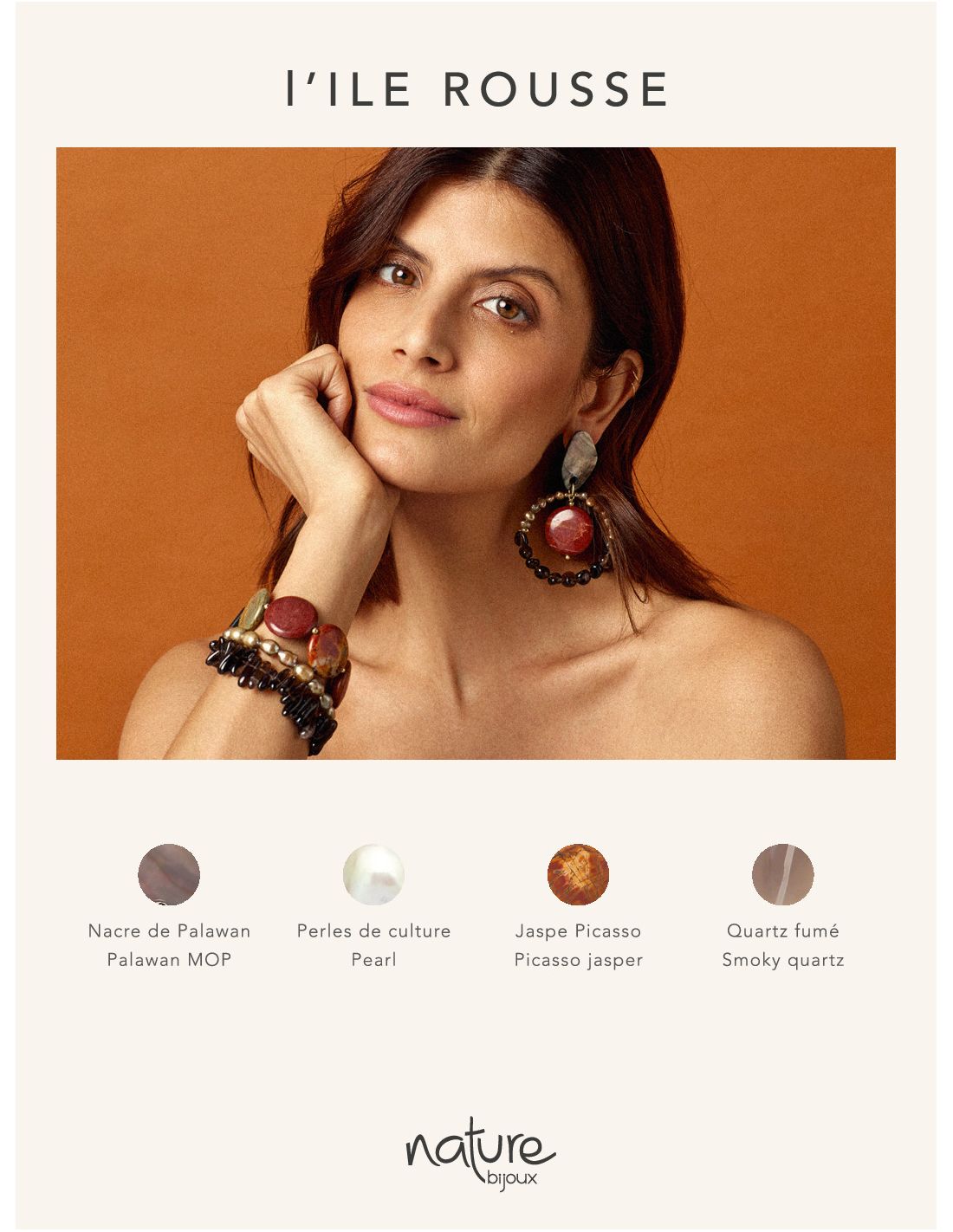 Inspirée de l'un des plus beaux golfes de Corse, cette magnifique collection nous conduit dans une nature exceptionnelle, au milieu de roches, sable chaud et lumière unique. Jaspe Picasso, perles de culture, quartz fumé et nacre de Palawan ont été choisis pour évoquer ces paysages minéraux de toute beauté !