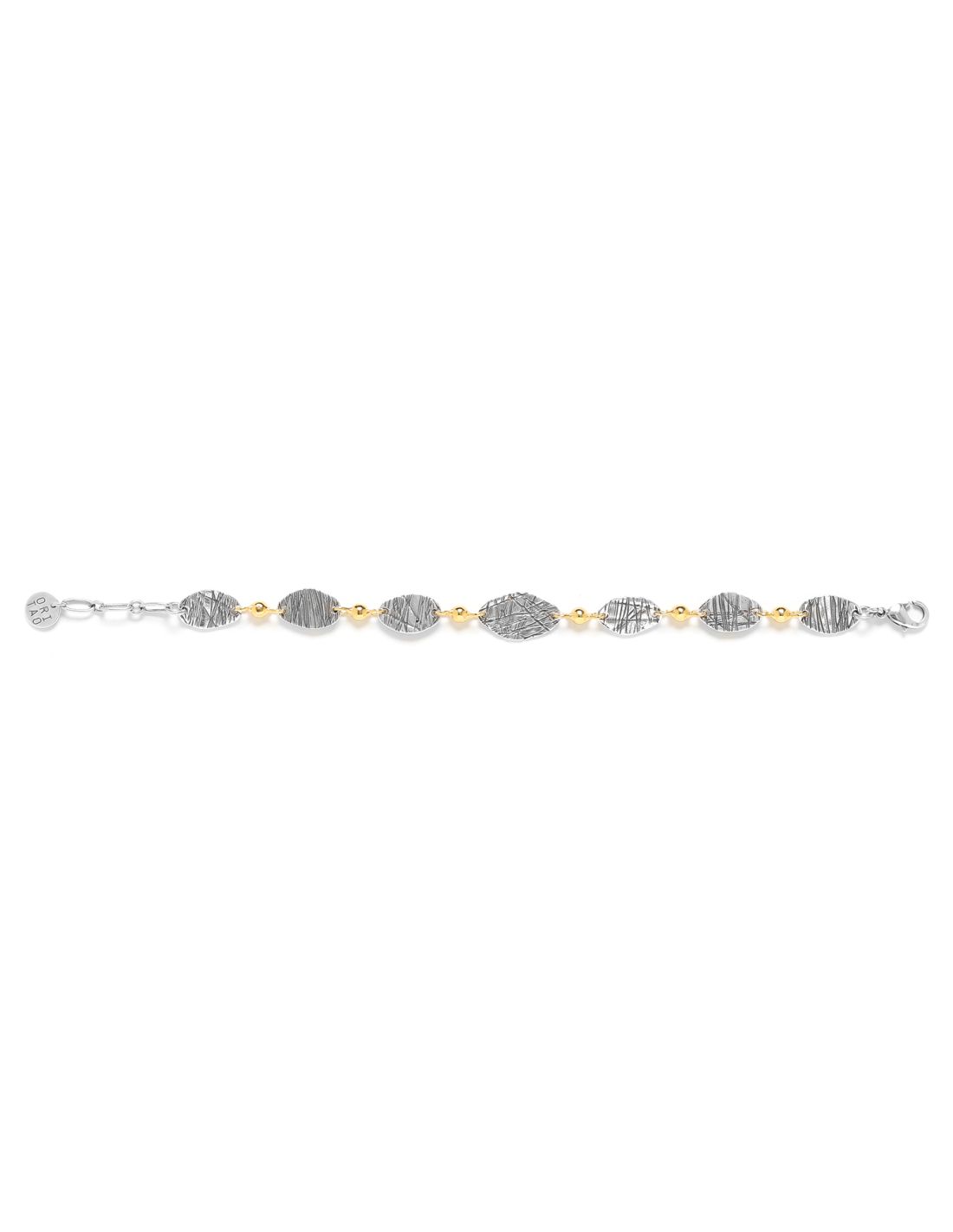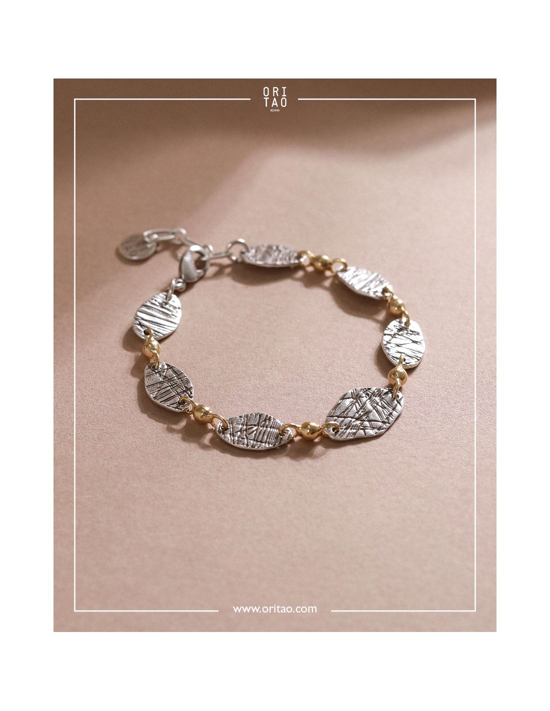 Le bracelet multi éléments collection Empreinte de Ori Tao est un bracelet avec fermoir, éléments dorés et argentés texturés